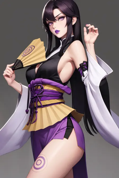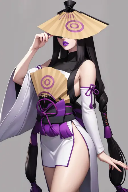 Note: covered eyes on it's own may produce undesired effects, either prompt her purple eyes instead or use the hand fan, folding fan with it.