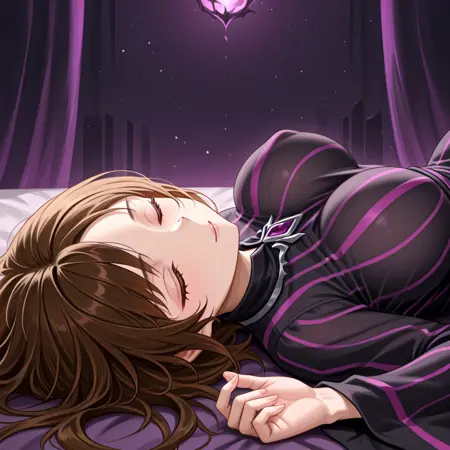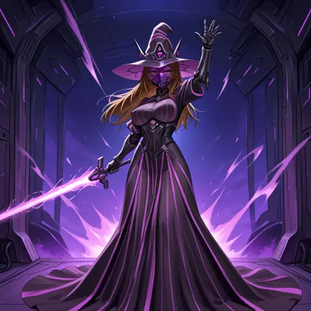 추가 태그: 마법사 모자, 미래적 옷차림, 금속 헬멧, 마스크형 헬멧, 빛나는 보라색 마스크, 세부적인 얼굴 특징, 긴 갈색 머리카락, 긴 드레스, 검정과 보라색 줄무늬 옷, 큰 가슴, 금속 장갑