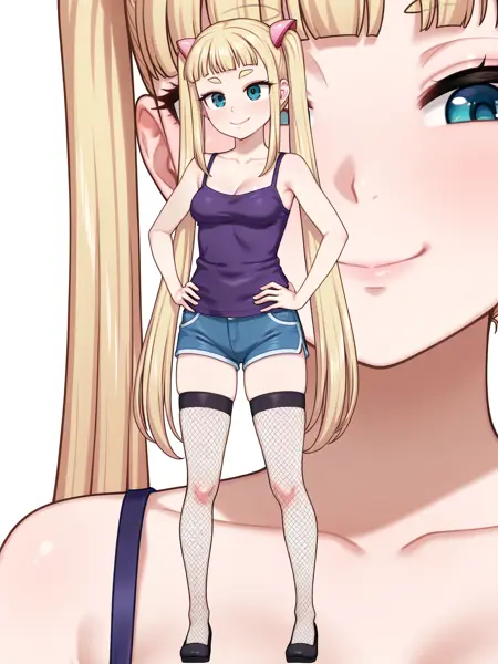 (よりSFWなスタイルにするには、独自の衣装タグを追加してください。ここではビキニとパンツの下に服を追加しています。)