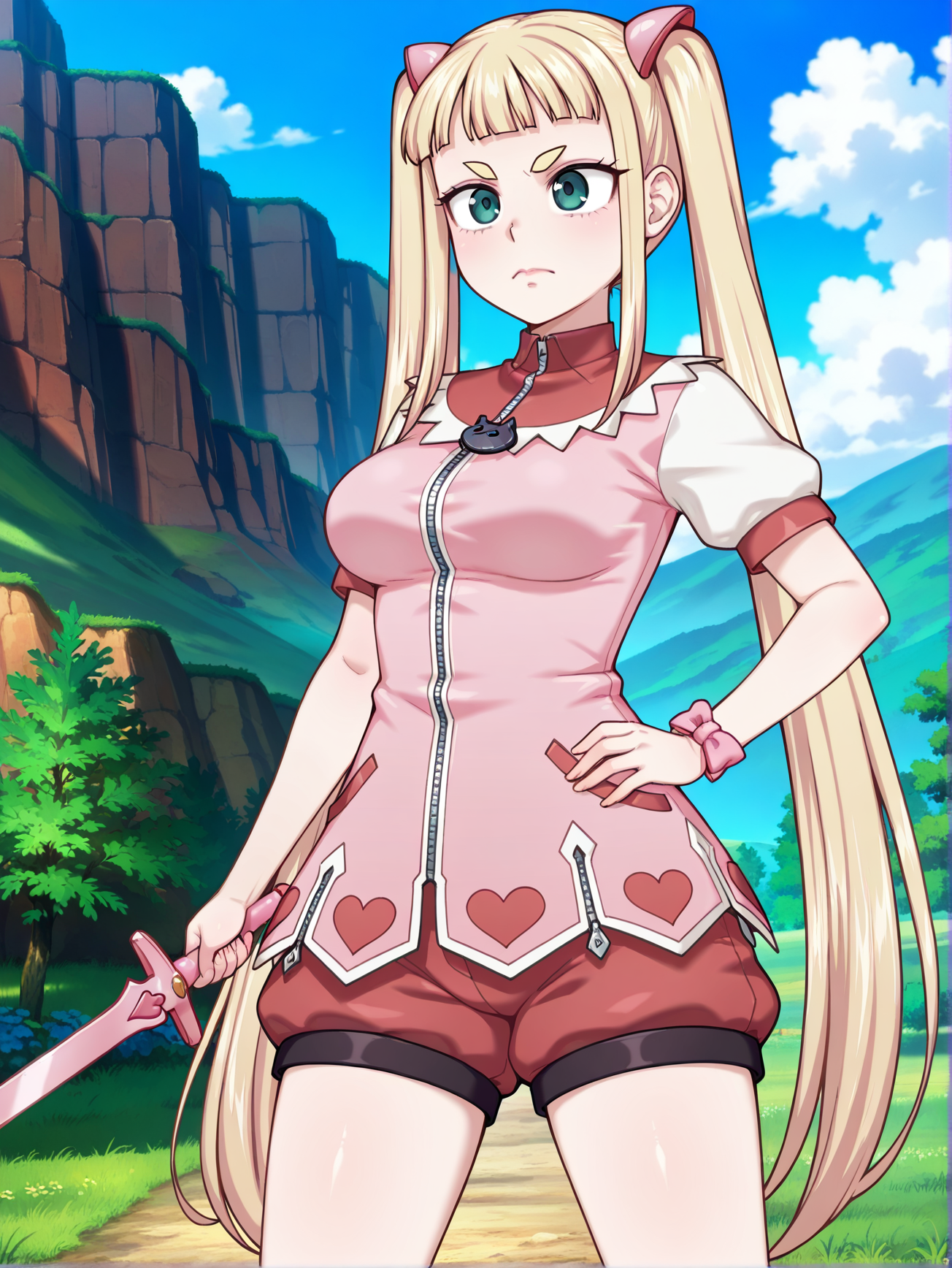 konoha \(magical girl konoha\), 魔法少女の衣装, 猫型ジッパーつり, ピンクのリストバンド, 赤いふわふわショートパンツ, 黒いフリルソックス, 赤いメイジシューズ(必要に応じて目や髪の色を追加)