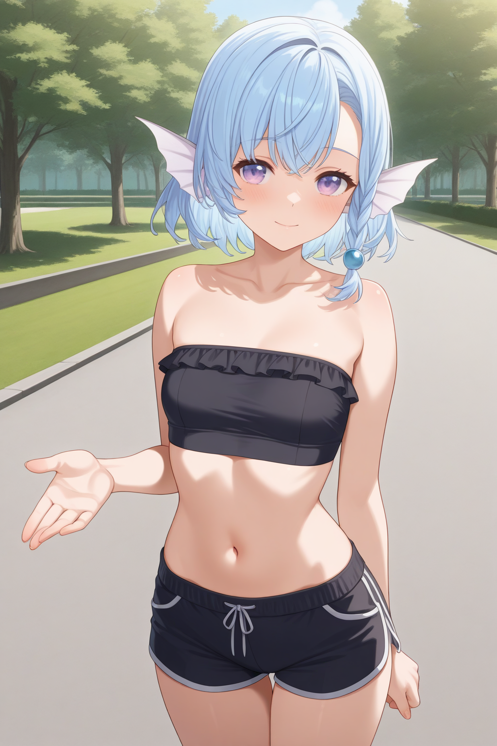 aaerio, head fins, purple eyes, blue hair, side braid, hair bobbles, webbed hands, erioidol, blue sailor collar, blue neckerchief, white shirt, sleeveless shirt, crop top, wrist cuffs, midriff, blue skirt, pleated skirt,