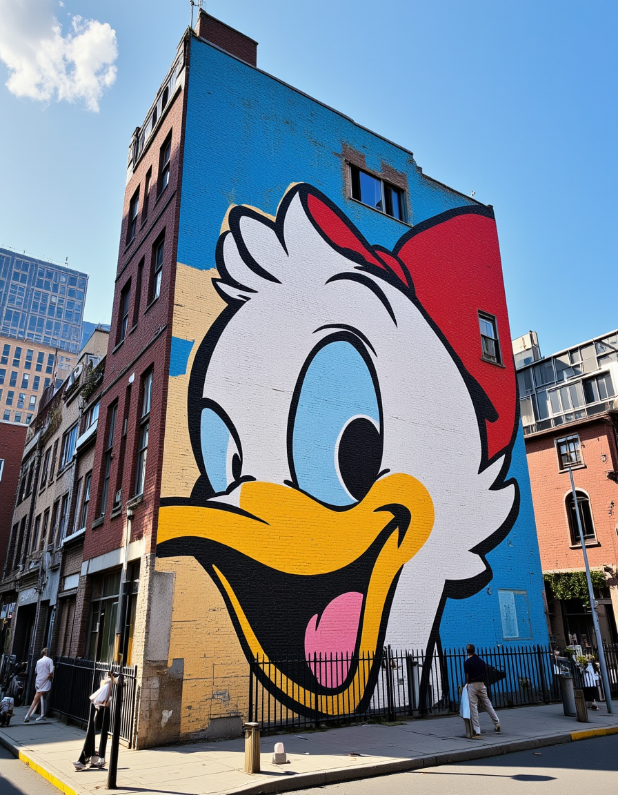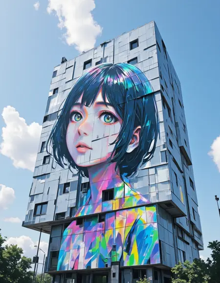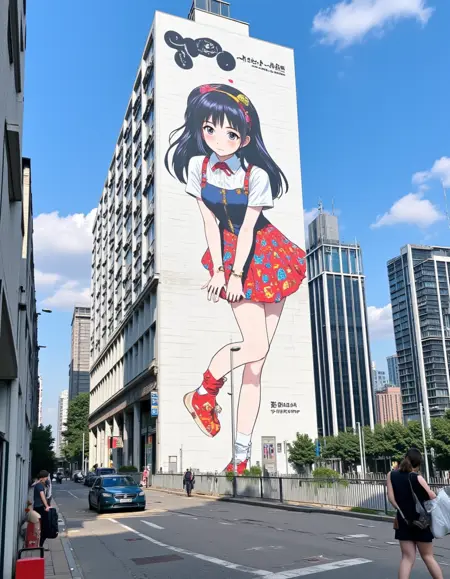 wabkg, 写实世界,照片风格。在一座城市中,聚焦于一座现代高楼的墙壁表面,有一幅色彩鲜艳的可爱日本动画女性全身画像。晴天,蓝天白云。低角度拍摄。人行道上有行人。