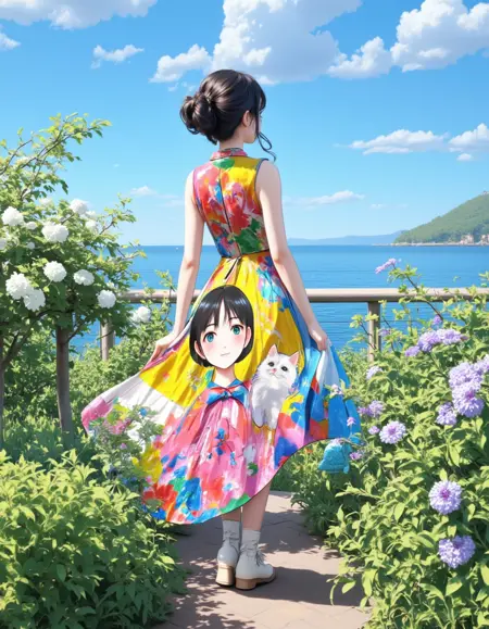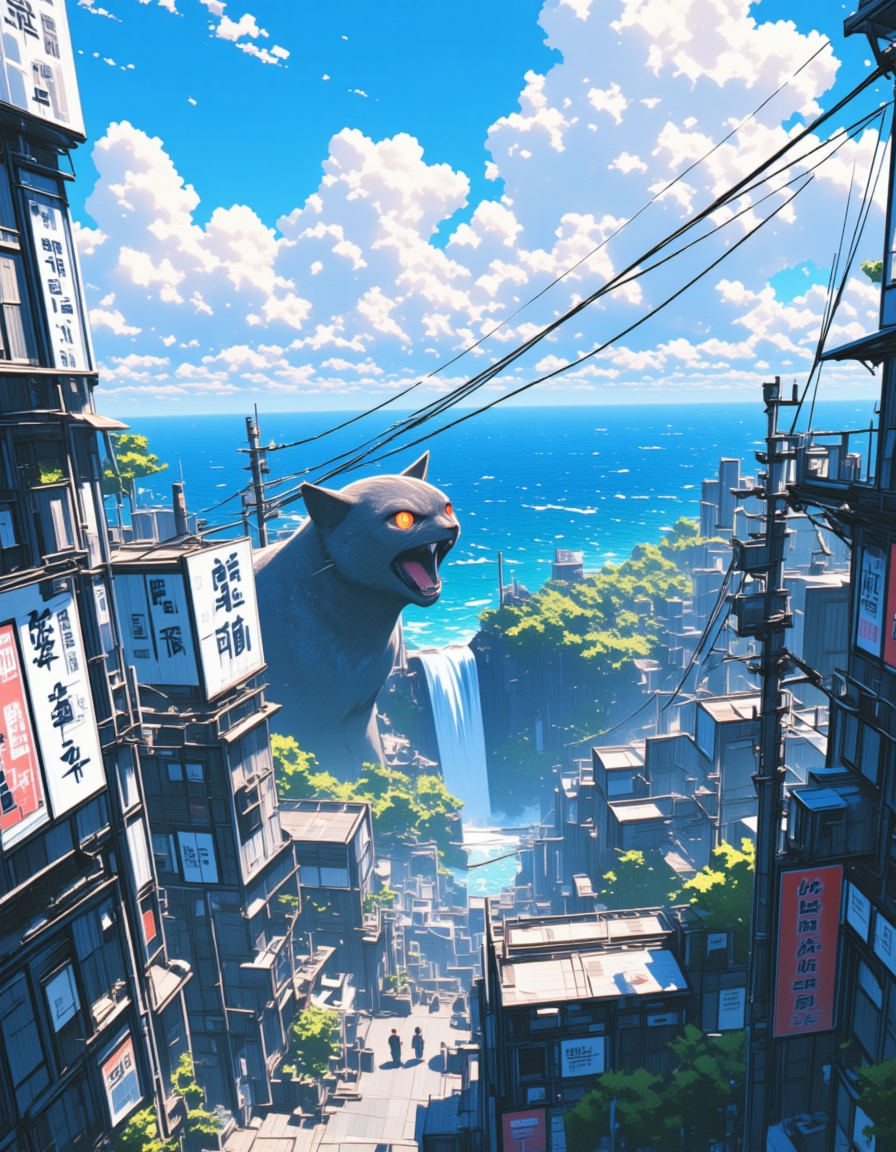 wabkg, 动画世界,动画风格。在海滨小镇,建筑墙壁上有一些汉字广告牌。晴天,蓝天白云。汉字。从肩部上方视角,侧视。植被。行人。电线杆和电线。远处是美丽的蓝色海景。俯视。T10,瀑布,波浪,火泡,柔焦,HID16,巨猫,张嘴,发光眼睛,愤怒,利爪,巨大,庞大,