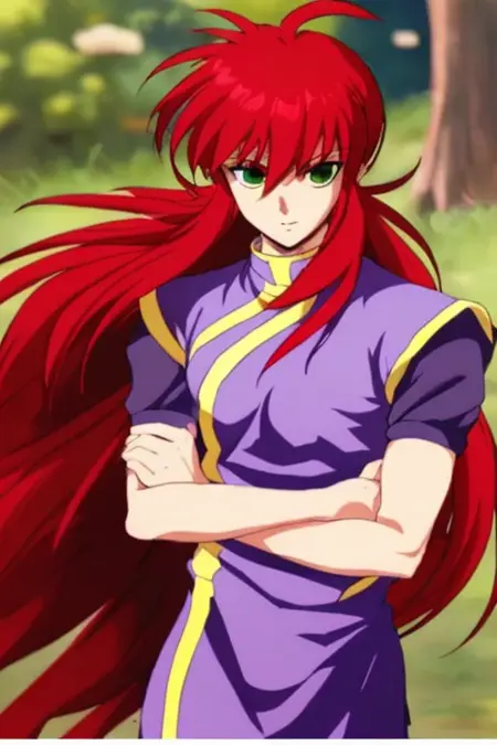long hair,red hair,Yellow martial arts uniform with white sleeves,green eyes,