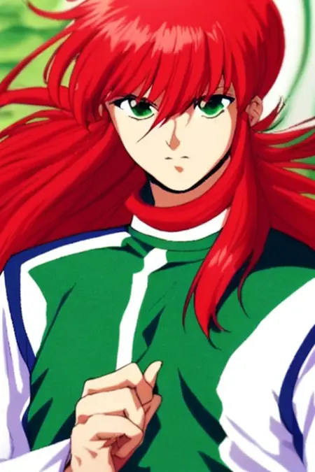 long hair,red hair,green eyes,Green martial arts uniform