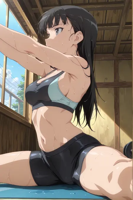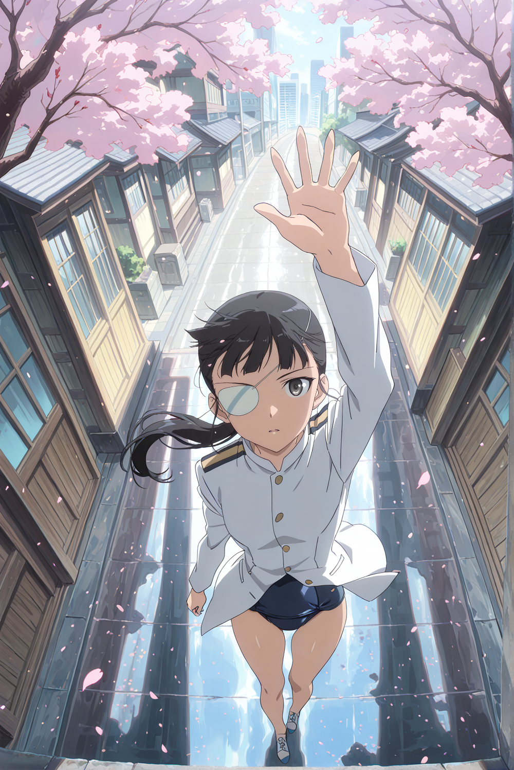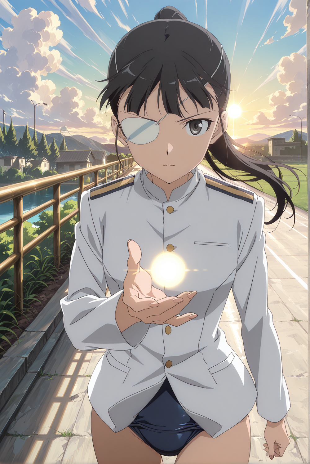 デフォルト:mio-sa、def、1girl、黒髪、黒目、アイパッチ、ローポニーテール、ロングヘア、ソロ、軍服、白いジャケット、軍用ジャケット、学校水着、ブルマ