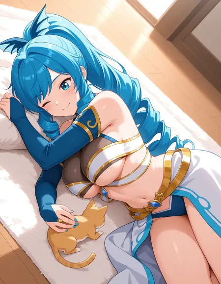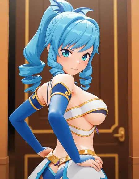 服装:蓝色袖子、新娘手套、可拆卸袖子、露肩、下胸、肚脐、蓝色内裤、秀场裙