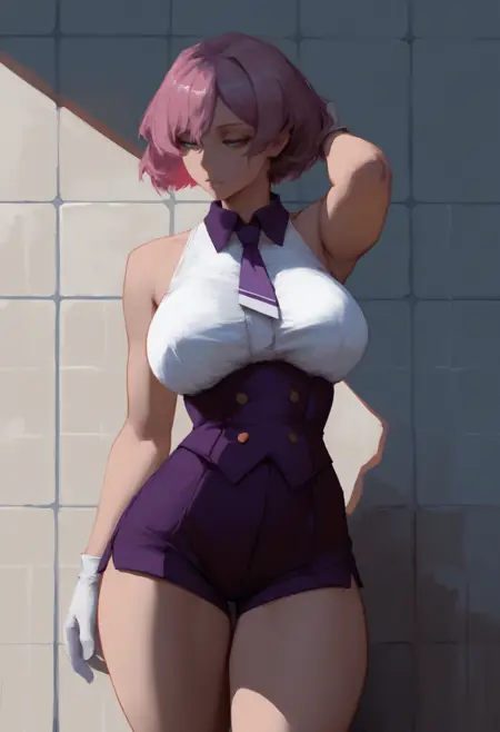 默认服装: 白色夹克,军装夹克,敞开夹克,肩章,长袖,白衬衫,有领衬衫,短领带,紫色领带,紫色紧身胸衣,胸下,白色手套,紫色短裤,大腿
