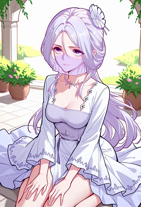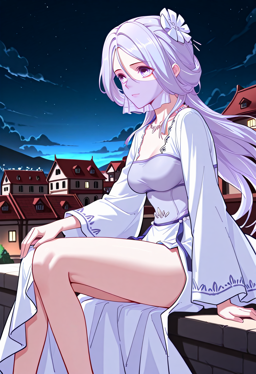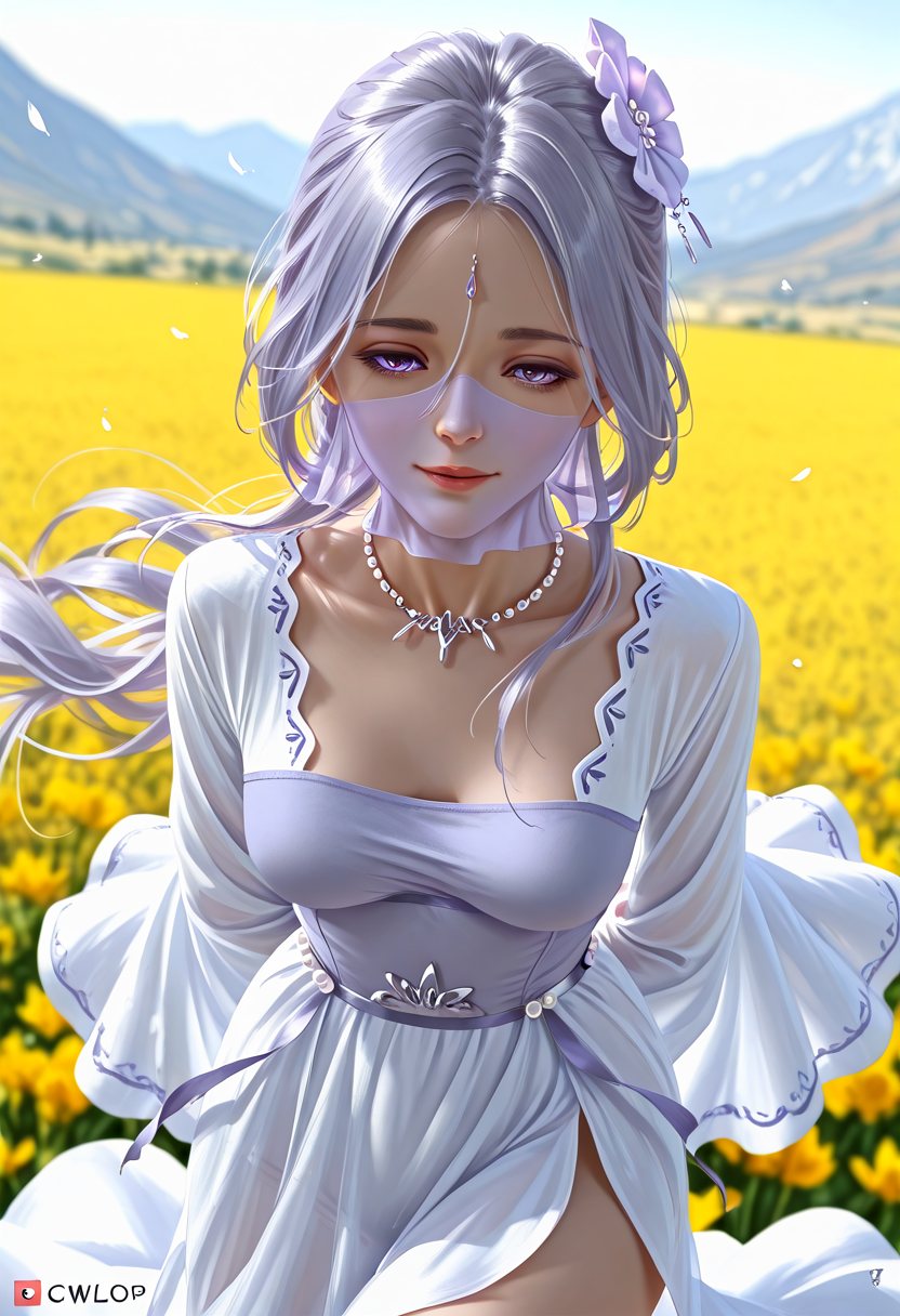 | トレーニングワード | Chu_Qingcheng_IL, 1girl, long purple hair, wavy hair, Soft wavy strands, hair ornament, parted bangs, purple eyes, hair between eyes, necklace, medium breasts, face veil, soft light purple veil, elegant outfit, white dress, layered dress, pearl accents, high slit dress, wide sleeves, flowy fabric, ornamental belt, waist gems, floral chest designコピーしました! |