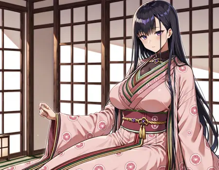 long hair,black hair,purple eyes,layered kimono,japanese clothes