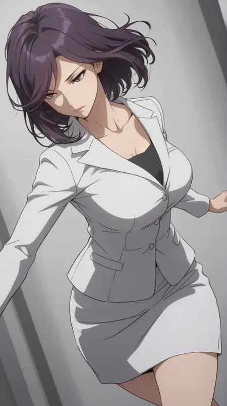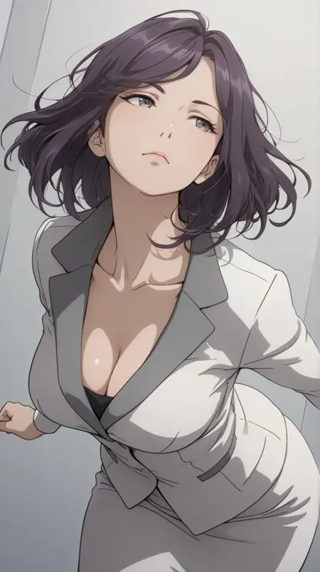 purple hair, grey eyes, medium hair, swept bangs, mature female,