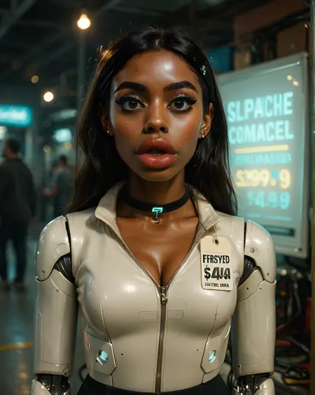Those model will made a robot I girl on sale- either on a poster, behind a glass, or with a price tag. Text and numbers are garbled on SDXL. Source images have good text.