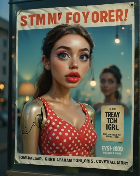 이 모델은 포스터 뒤, 유리 안, 또는 가격표가 달린 상태에서 판매 중인 로봇 소녀를 생성합니다. SDXL에서는 텍스트와 숫자가 깨집니다. 소스 이미지의 텍스트는 좋습니다.