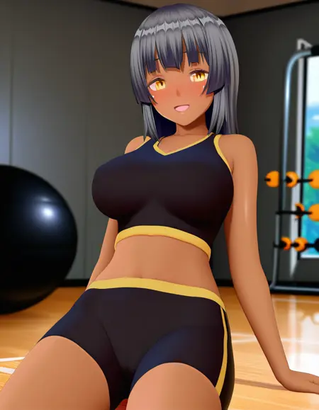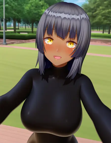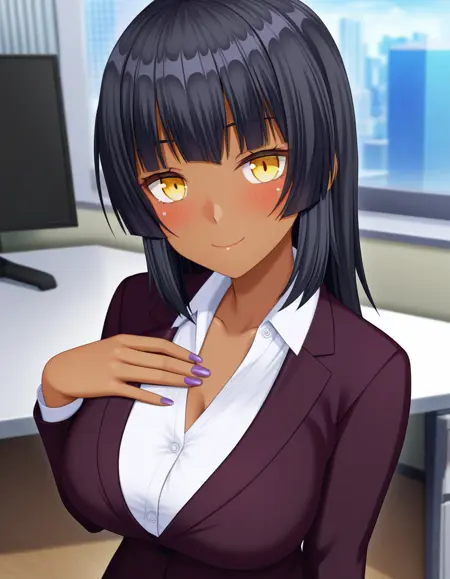 深色皮肤、深色皮肤女性、黄眼睛、黑发、大乳房、黑发、齐刘海、刘海:必需