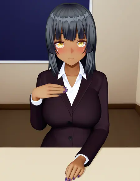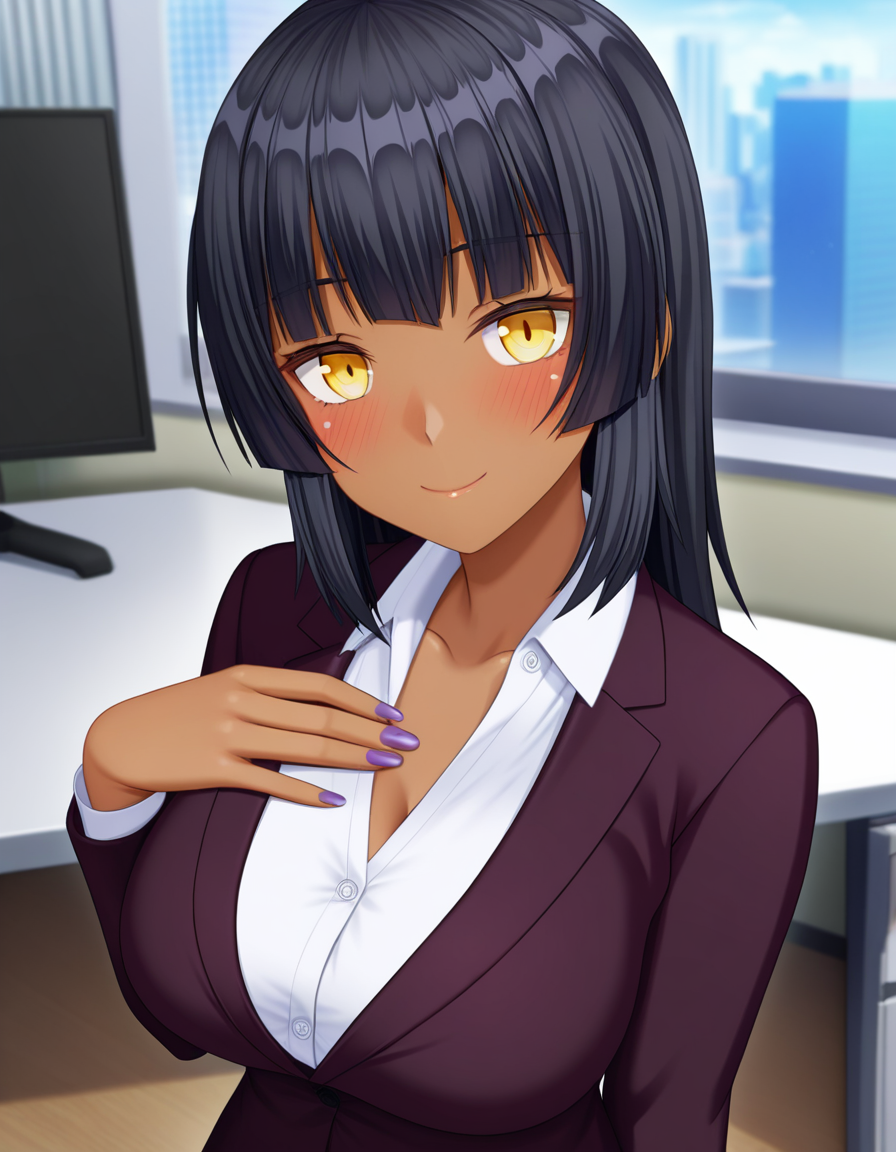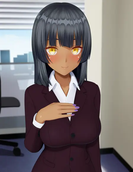 검은 피부, 검은 피부 여성, 노란 눈, 검은 머리, 큰 가슴, 검은 머리, 앞머리, 앞머리: 필수