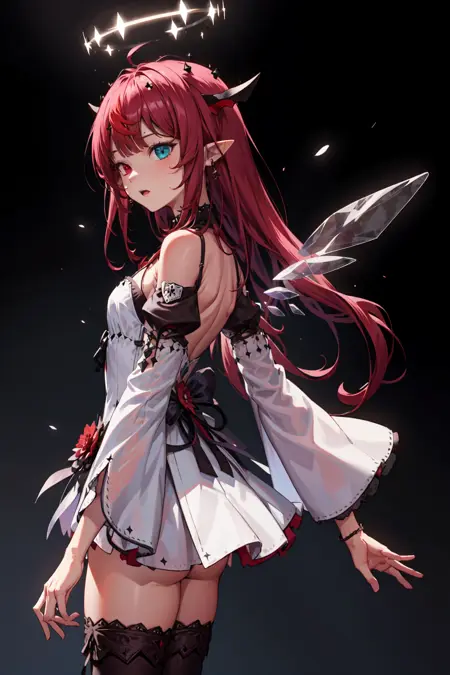 彼女のメイン衣装には以下を使用してください:irys \(hololive\), 長い髪, 異色瞳, 尖った耳, 角, 別れ袖, 翼, ハロ, 紫色の太ももまであるストッキング, 白いドレス