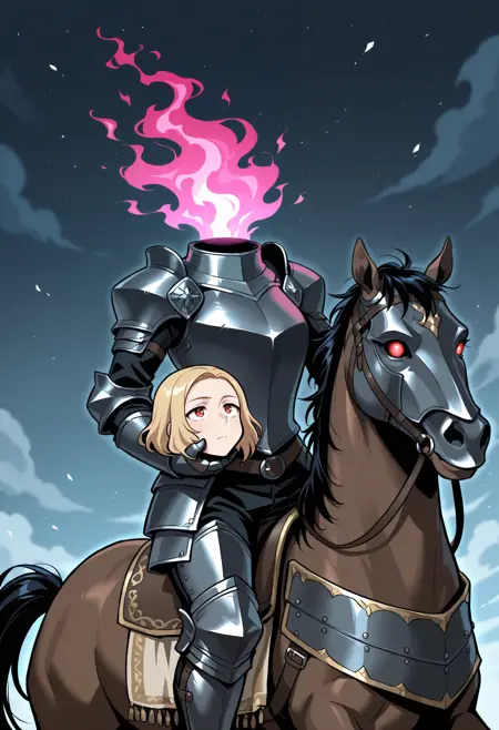A dullahan is a headless rider from Irish folklore, often seen carrying its own severed head under one arm while riding a black horse. Cloaked in darkness, the dullahan is a harbinger of death, calling out names of those doomed to die. Its eyes glow with eerie light, and its voice is said to echo like the grave. Where the dullahan stops, death soon follows—swift, silent, and certain.