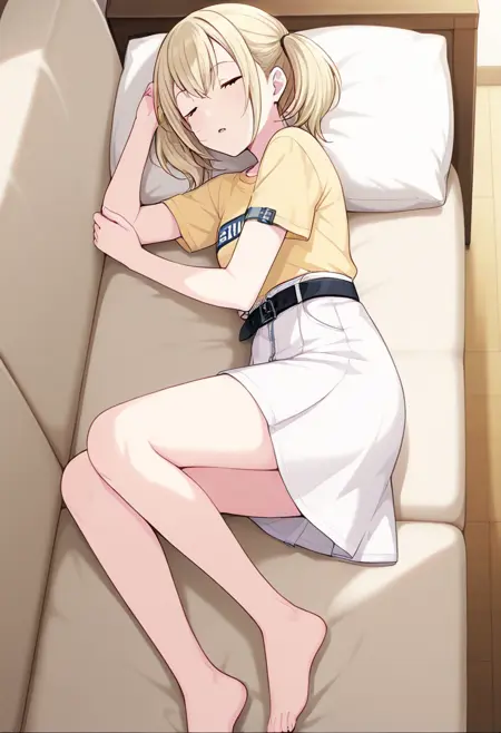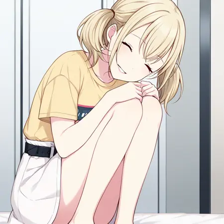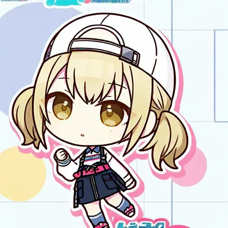 トリガー語: kohaneyt衣装: 1girl、帽子、靴下、靴、ツインテール、シャツ、スカート、スニーカー、長袖、白い頭部装具、白いシャツ、金髪、赤い履物、ピンクのベルト、ベルト、膝上靴下、襟付きシャツ、ベースボールキャップ、黒いスカート、黄色い目、前髪、短いツインテール、青い靴下