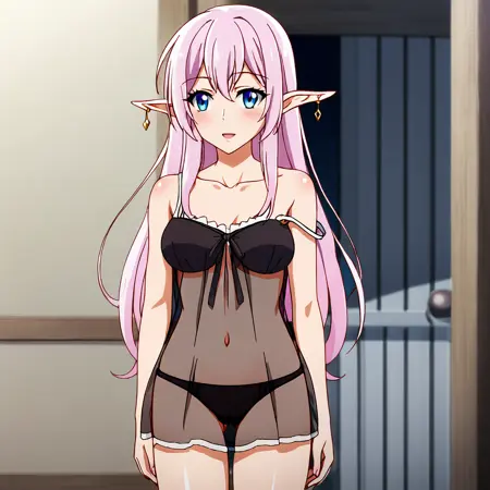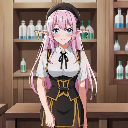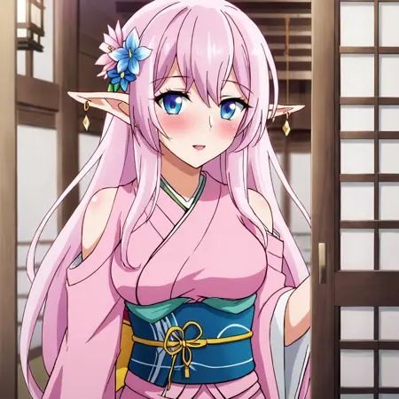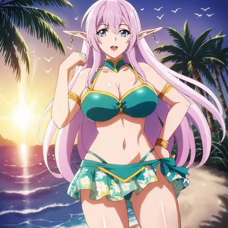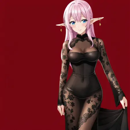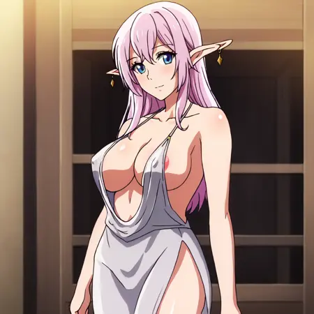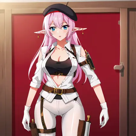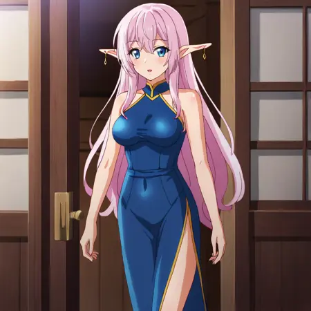 - 触发词:YarandralaBanished, 1girl, 尖耳朵, 乳房, 衣服镂空, 粉色头发, 饰品, 蓝眼睛, 耳环, 精灵, 深沟, 白色过膝袜, 裸露肩膀, 连衣裙, 西部镜头
