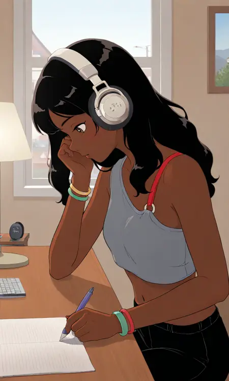 1girl,very dark skin,long hair,black hair,brown eyes,single-shoulder shirt,grey shirt,crop top,navel,bracelet,black pants,o-ring straps