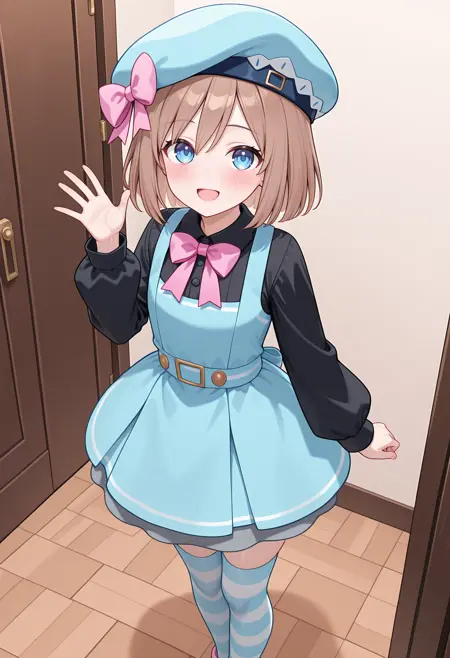 - nromaca, 发饰, 粉色蝴蝶结, 贝雷帽, 蓝色头饰, 帽子蝴蝶结, 蓝色连衣裙, 粉色领结, 围裙连衣裙, 黑色衬衫, 长袖, 灰色裙子, 裙下裙, 条纹过膝袜, 蓝色过膝袜,