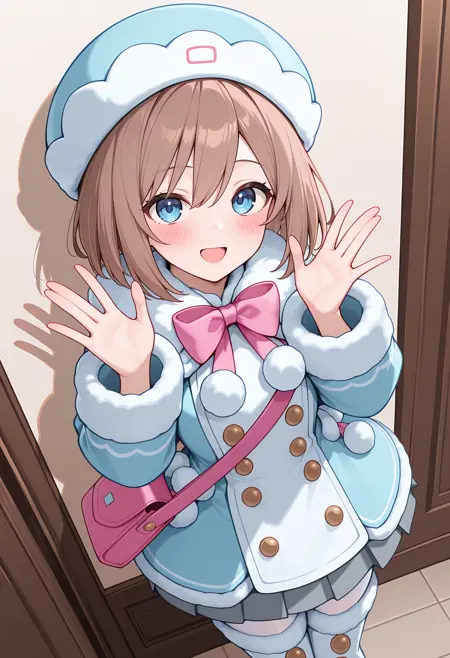 - nromdef, 帽子, 蓝色头饰, 蓝色外套, 礼服外套, 毛球 \(服装\), 双排扣, 毛皮镶边外套, 粉色领结, 灰色裙子, 裙下裙, 百褶裙, 白色连裤袜, 靴子, 包,