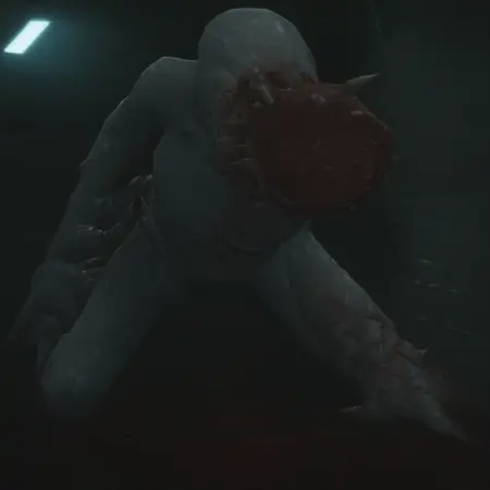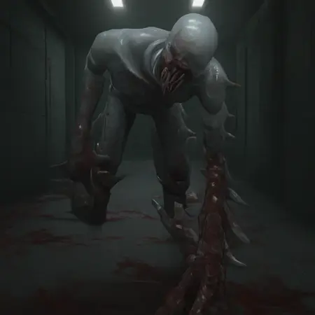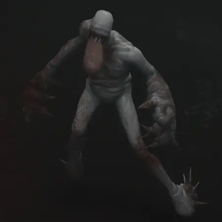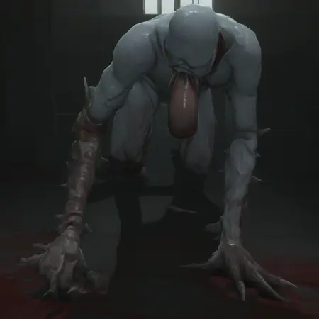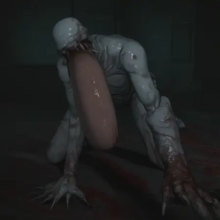 rerooze, nude, colored skin, monster boy, claws, wet, blood on face, pale skin, white skin, melted skin, sagging skin, spikes, no eyes, bone, no toes, blood on leg, oversized forearm, human arm, no feet, sharp teeth, human arm, large tongue