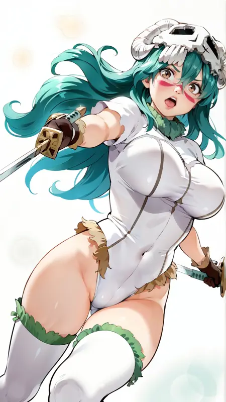 例のプロンプト: "nelliel_tu_odelschwanck, an anime girl, 1girl, solo, long hair, breasts, open mouth, large breasts, simple background, thighhighs, gloves, white background, holding, weapon, green hair, sword, holding weapon, white thighhighs, leotard, floating hair, facial mark, holding sword, dual wielding, white leotard"