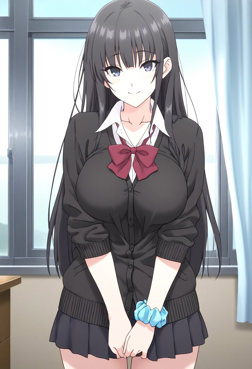 school uniform,bowtie,black cardigan,wrist scrunchie,black skirt,