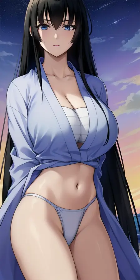 Chest_sarashi_Open_short_kimono_Fundoshi: 목욕 중 히나타소에서 사용한 sarashi(가슴 감싸개)와 fundoshi(속옷)만 착용한 미코 의상의 상의 부분