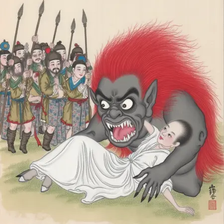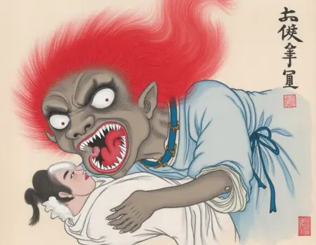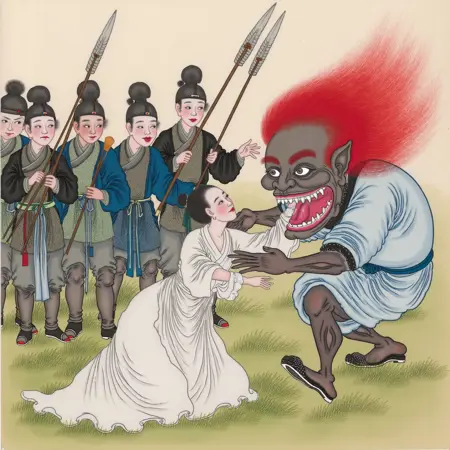 lora:Liaozhai\_flux\_style:1, Liaozhai,This image is a traditional Chinese ink painting, characterized by its intricate details and vibrant colors. The scene depicts a dramatic and fantastical narrative.