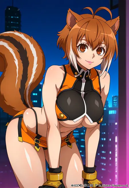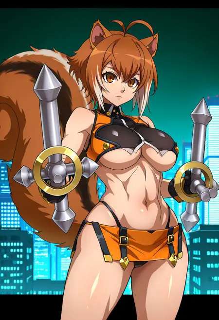 MakotoNanaya, 1girl, solo, large breasts, brown eyes, squirrel girl, squirrel ears, squirrel tail, underboob, toned, toned belly, solo, animal ears, crop top, tail, orange skirt, brown hair, short hair, multicolored hair, white hair, two-tone hair, lips, navel, tonfa, weapon, ahoge, highleg panties, underwear, revealing clothes, midriff, highleg, gloves, black panties, fingerless gloves, microskirt, nose, thighs, bare shoulders, dual wielding, shiny skin, smoothy skin,