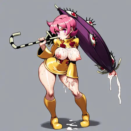 (Skullgirls_Umbrella, short hair, pink hair, pink eyes, yellow raincoat, boots, umbrella),