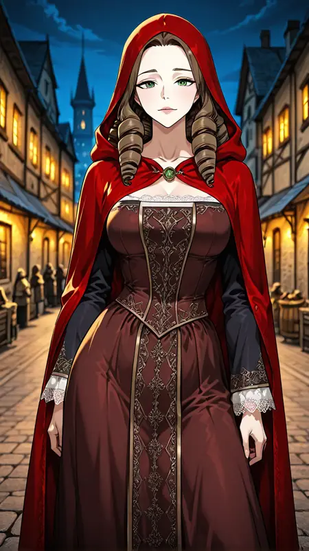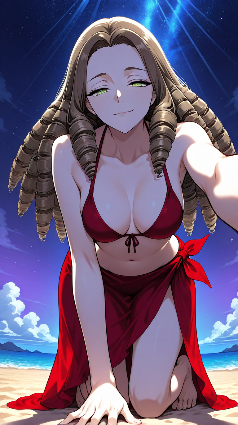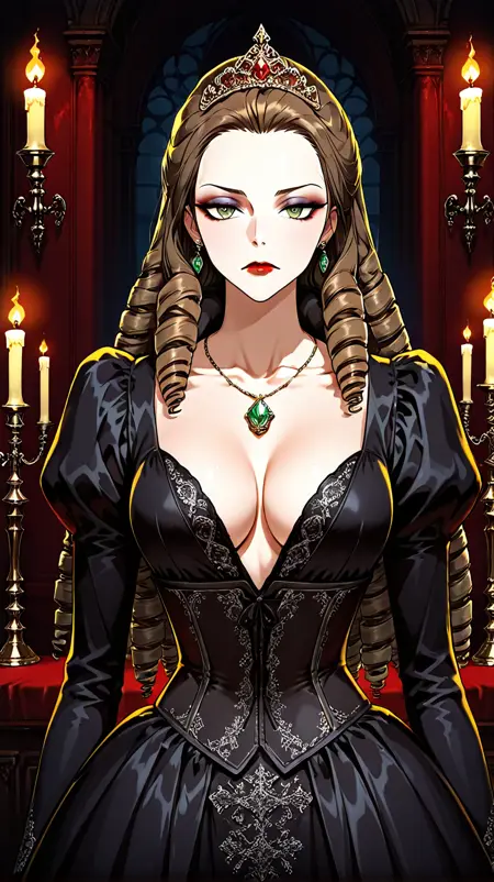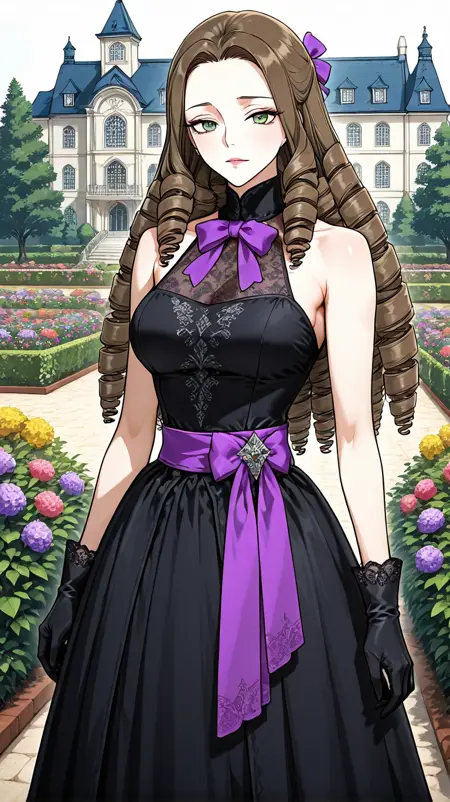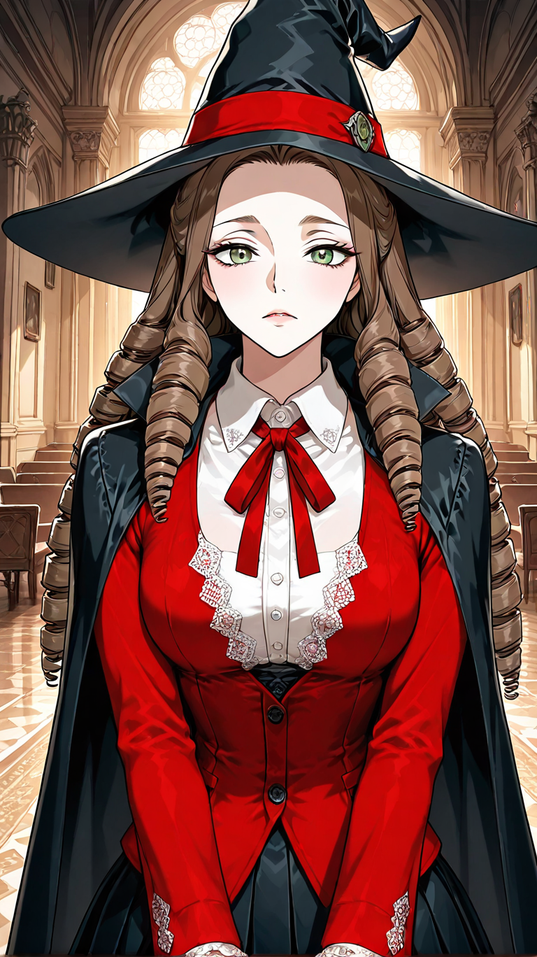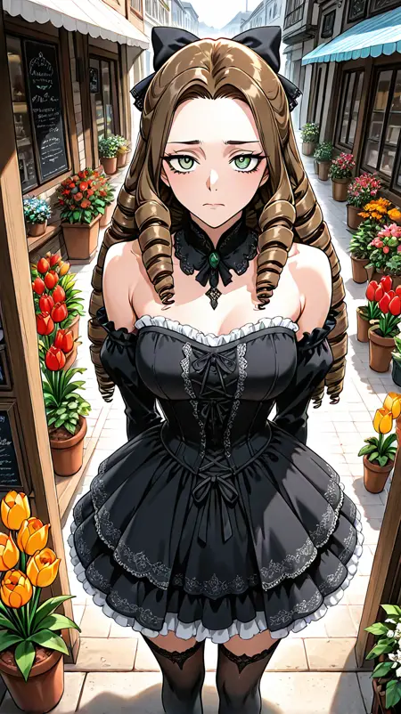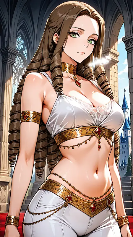 1girl, solo, il_ladych33, green eyes, brown hair, long hair, drill hair, medium breasts,