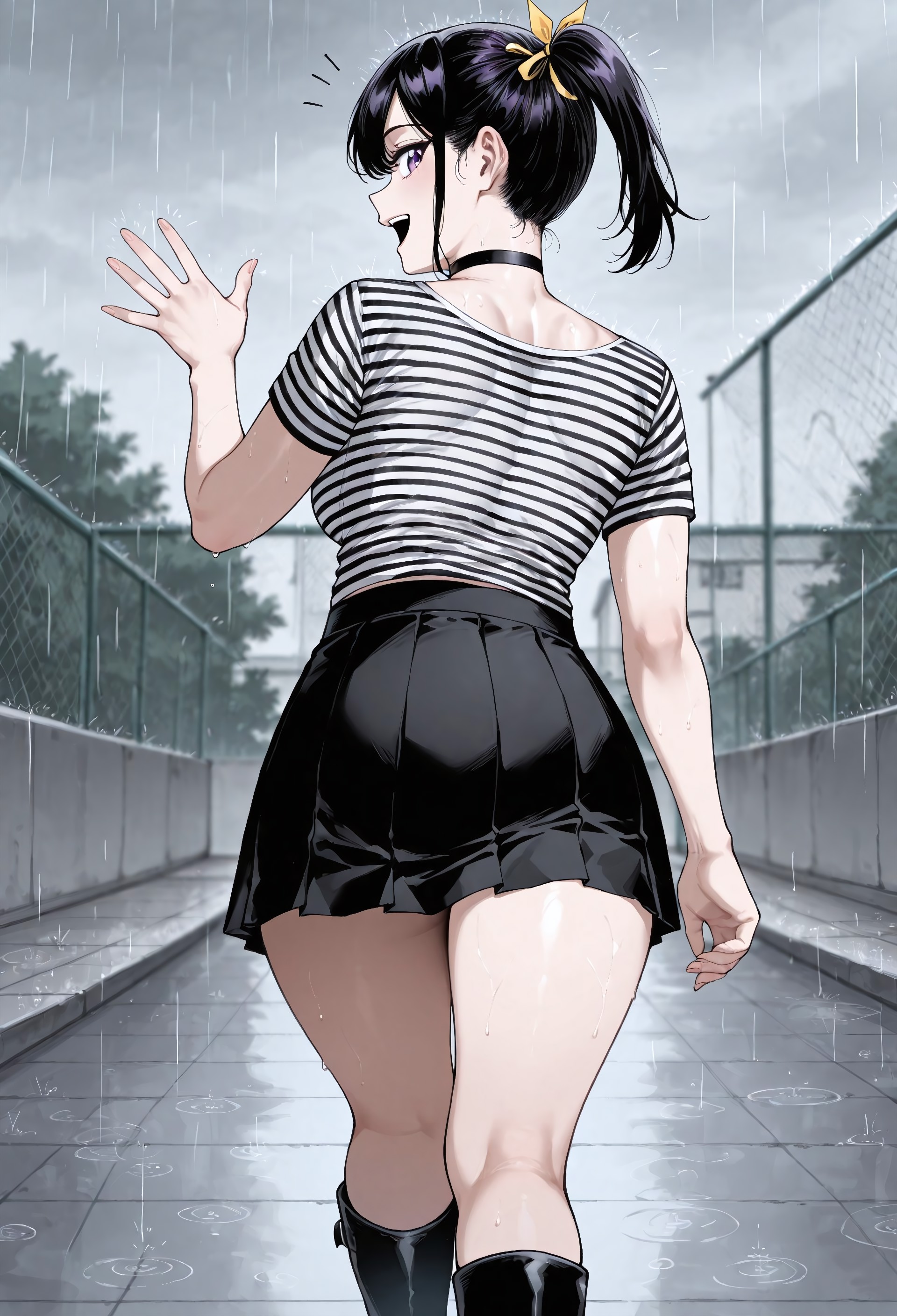 머리 장식, 머리 리본, 검은 초커, 골든 하트 초커, 투톤 셔츠, 흰 셔츠, 검은 셔츠, 줄무늬 셔츠, 검은 치마, 접힌 치마, 미니 스커트, 검은 신발, 부츠