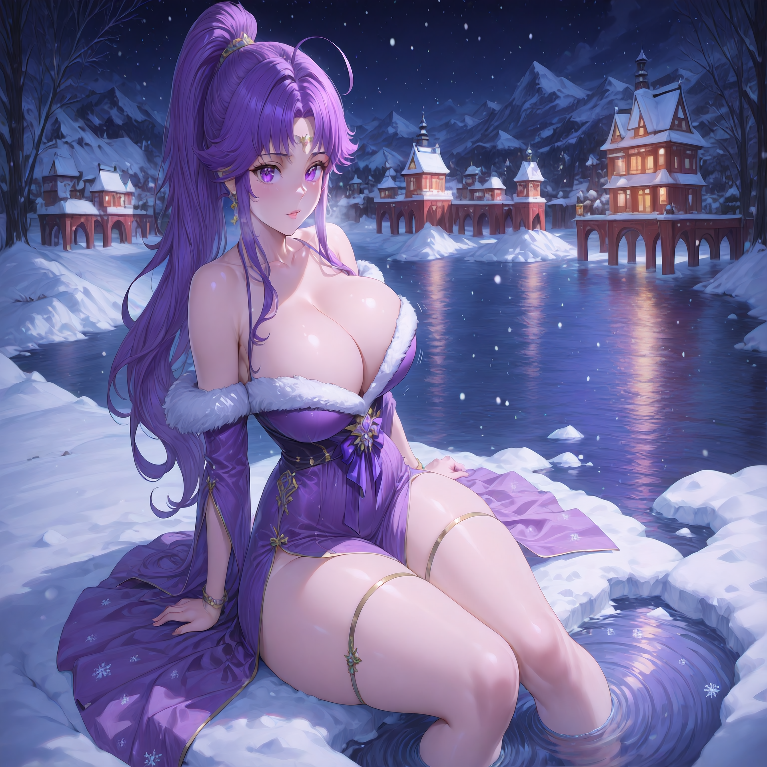 Northern,1girl,solo,purple eyes,long hair,thighs,purple hair,bare shoulders,ponytail,dress,fur trim,ahoge,purple dress,jewelry,