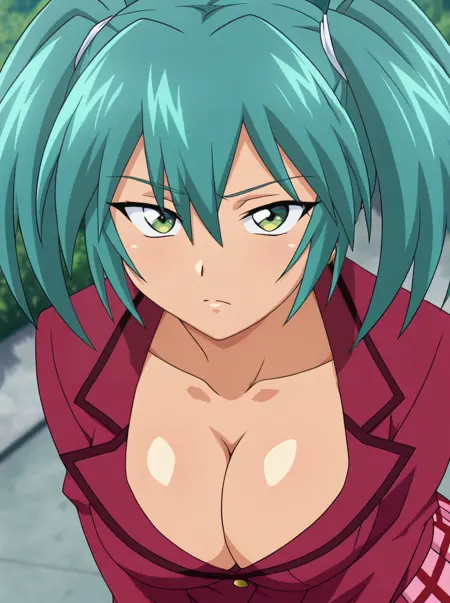 Prompts: 1girl, solo, twintails, breasts, green hair, green eyes, cleavage, large breasts, skirt, school uniform, jewelry, aqua hair , white socks, baggy socks,