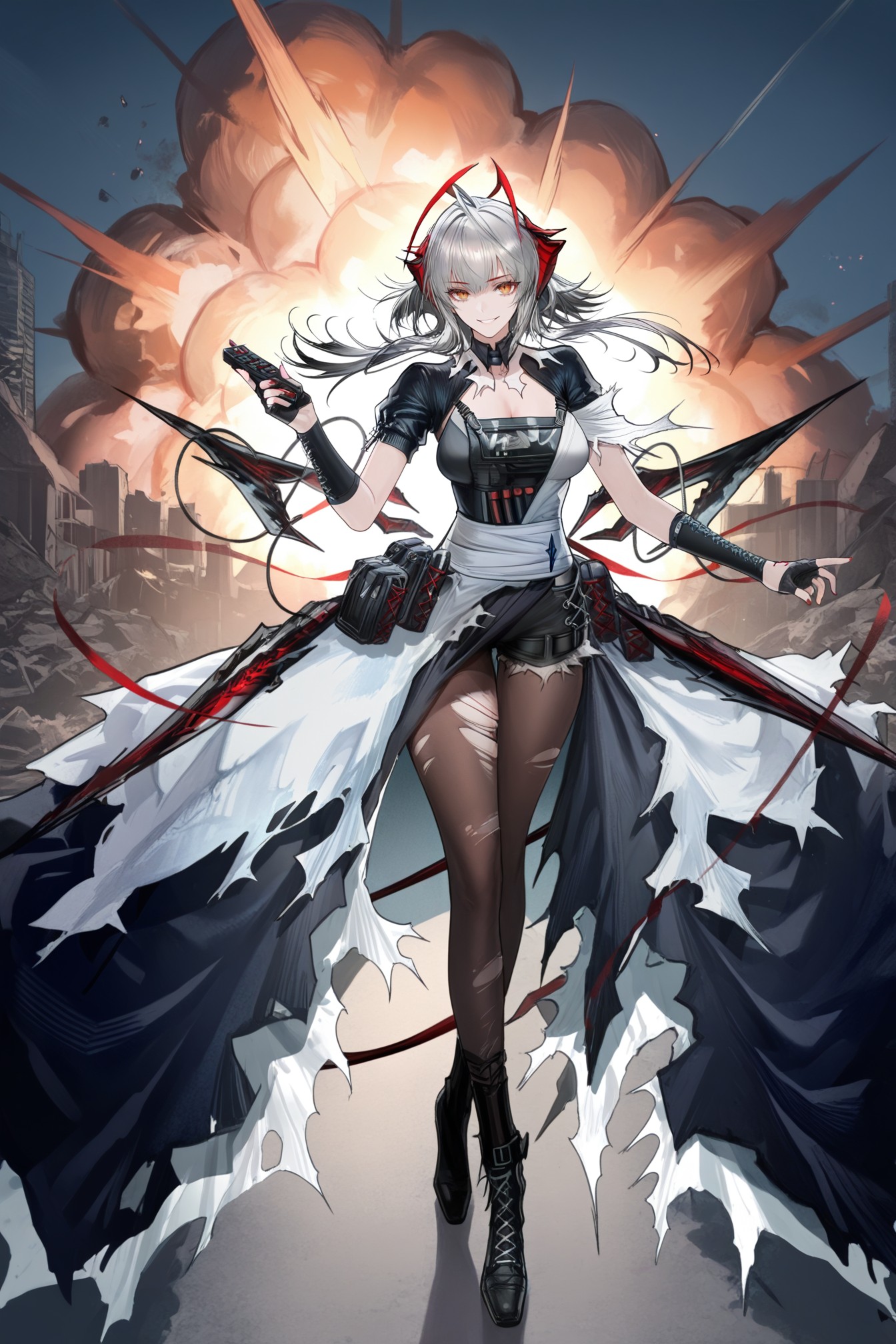 角色特征:grey hair, demon horns, yellow eyes, ahoge, antenna hair,