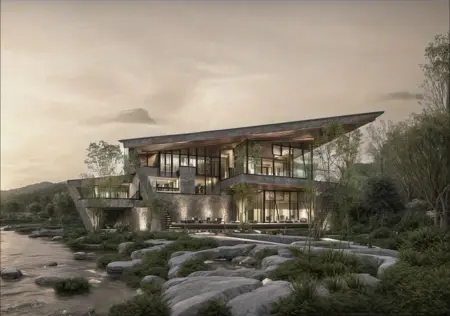 긍정적 프롬프트 단어: NH-6, 별장 주거용 건물, 돌담, 강, 비 오는 날