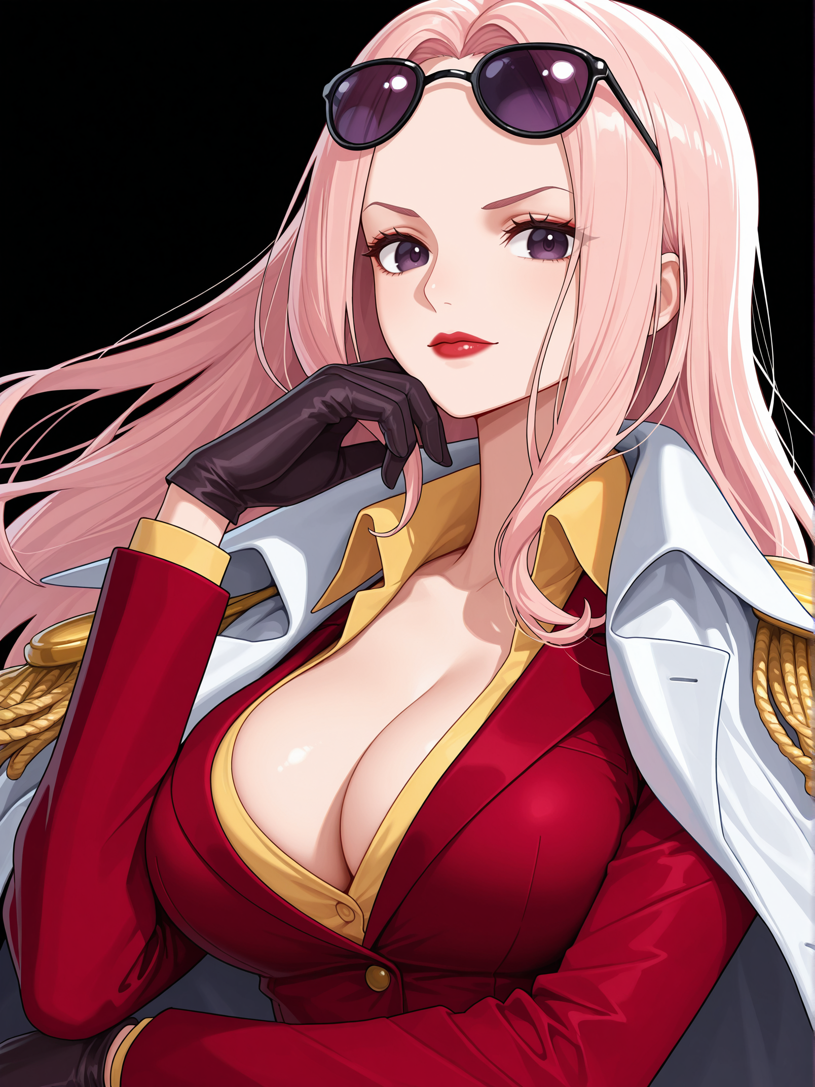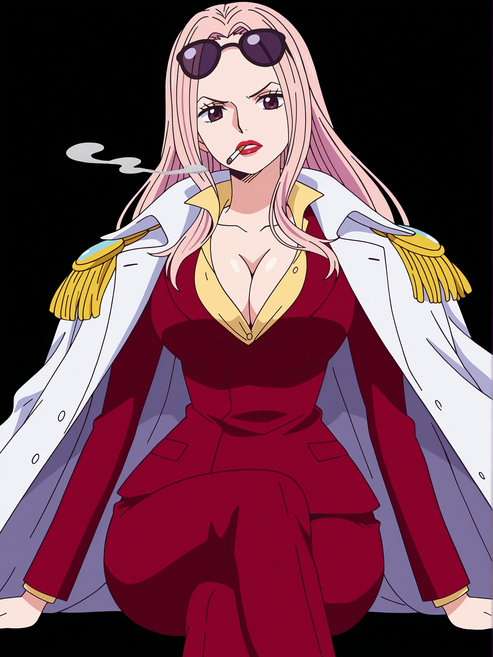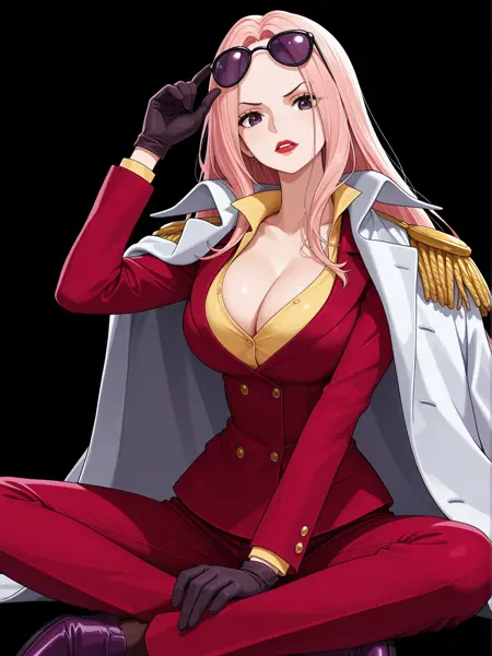 유니폼: 어깨에 코트, 어깨장식, 선글라스, 머리에 안경, 공식적, 빨간 정장, 노란 셔츠, 정장 안에 셔츠, 긴 소매, 흉부 노출, 검은 장갑, 보라색 신발