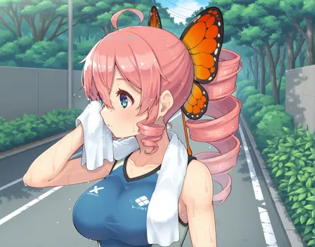 sakuraba himari,pink hair,ahoge,breasts,blue eyes, butterfly hair ornament,drill hair,drill ponytail,