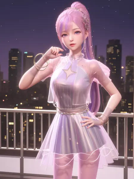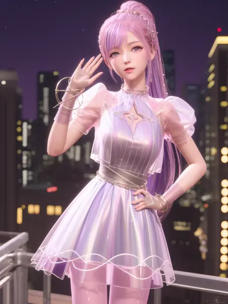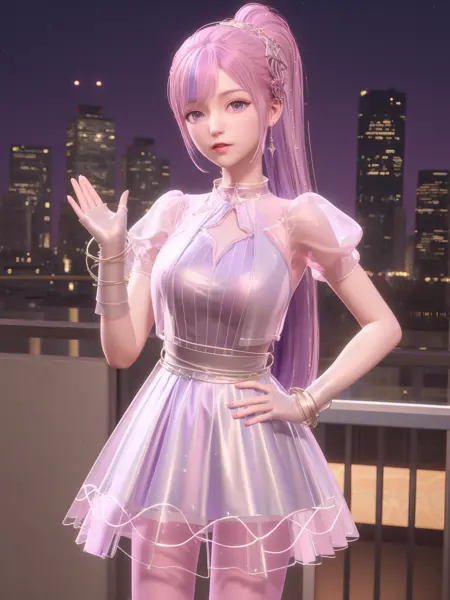 • SYNNxingmengyingli, solo, 1girl, long hair, purple eyes, jewelry, pantyhose, bracelet, ponytail, pink hair, hair ornament,dress,see-through,gloves,looking at viewer, clothing cutout,cityscape, night, mature female, cowboy shot, hand on hip,