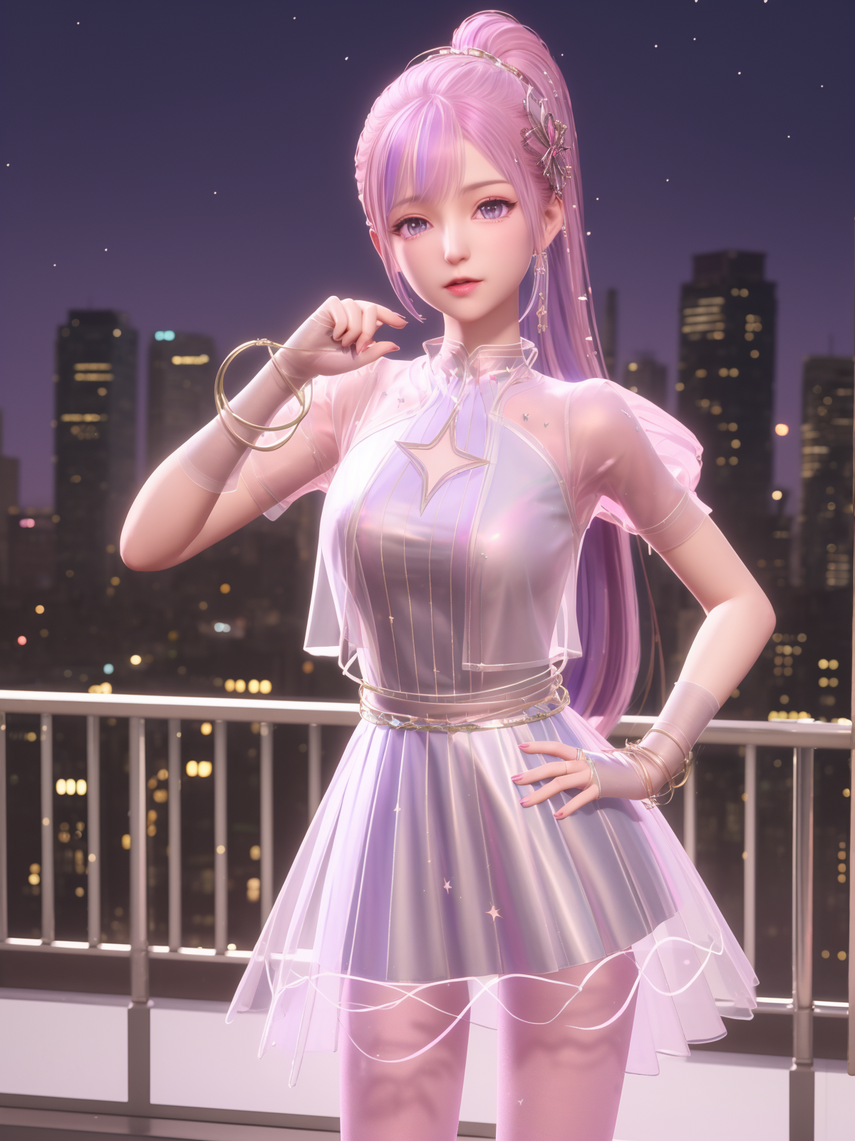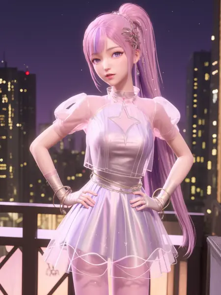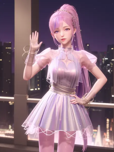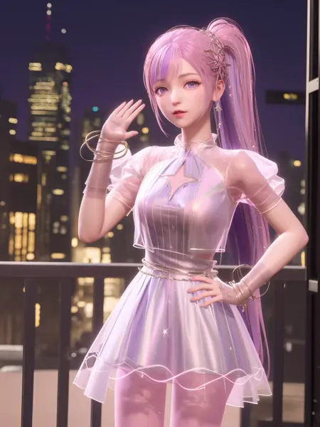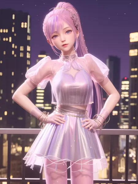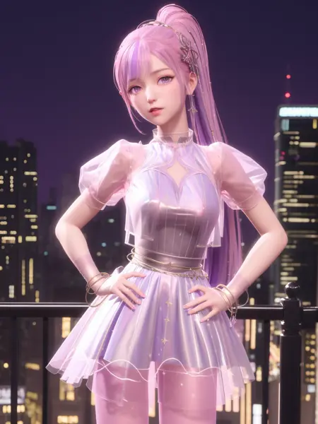 - SYNNxingmengyingli, solo, 1girl, long hair, purple eyes, jewelry, pantyhose, bracelet, ponytail, pink hair, hair ornament, dress, see-through, gloves, looking at viewer, clothing cutout, cityscape, night, mature female, cowboy shot, hand on hip,