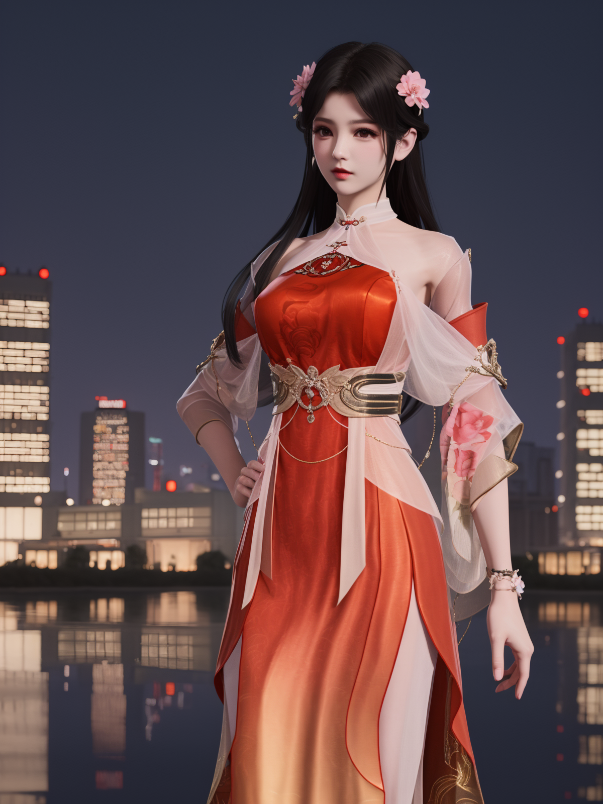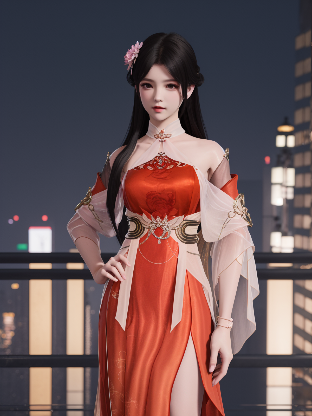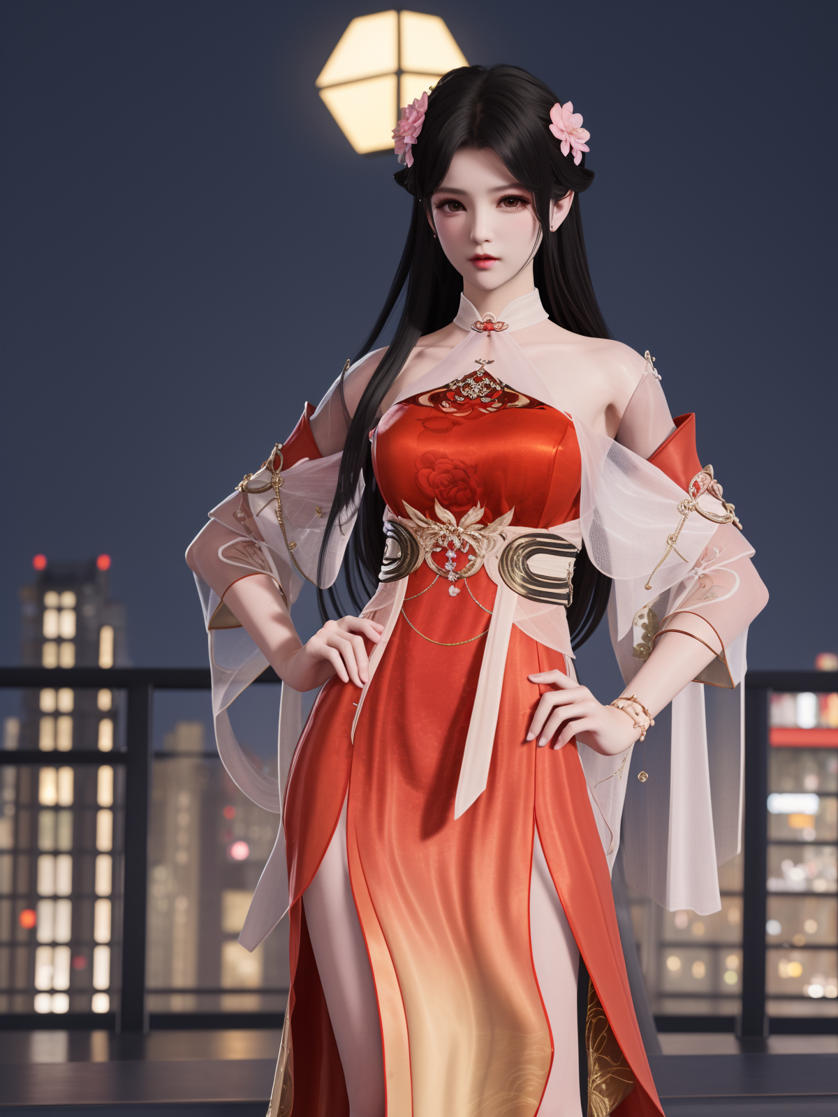 - YJWJyingzipingXQNYHhuajianying, 1girl, long hair, dress, solo, black hair,jewelry, bare shoulders,see-through, obi,detached sleeves, sash,choker,chinese clothes, looking at viewer, cityscape, night, mature female, hair flower,hand on hip,
