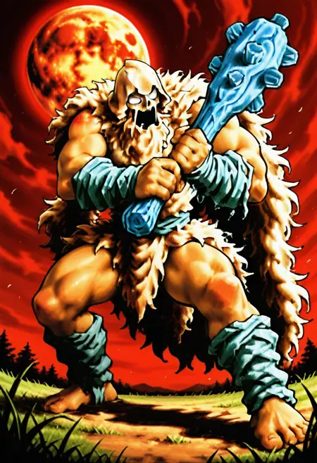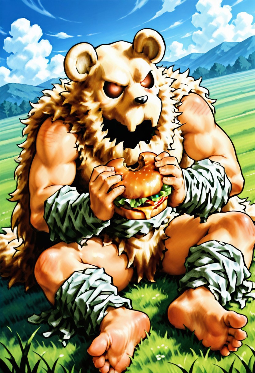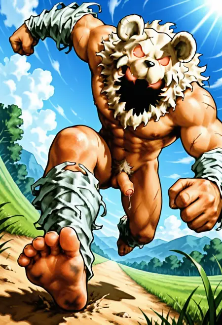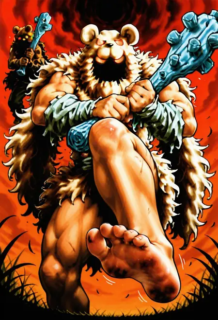fur clothes, fur cape, hood on blackface, burst hands, barefoot, burst arms, burst thighs,