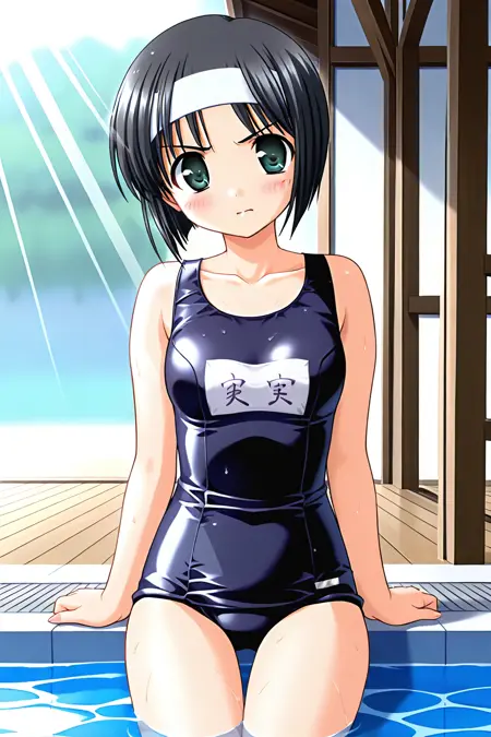 old school swimsuit, blue one-piece swimsuit, name tag,