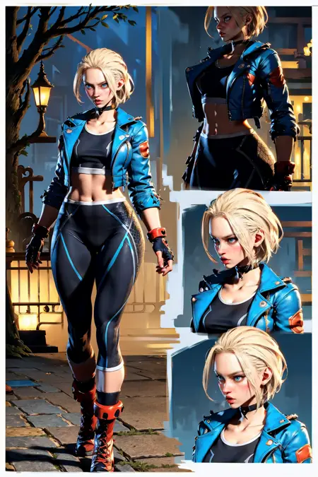 SF6 cammy 프롬프트: 단발, 파란 재킷, 검은 스포츠 브라, 요가 팬츠,