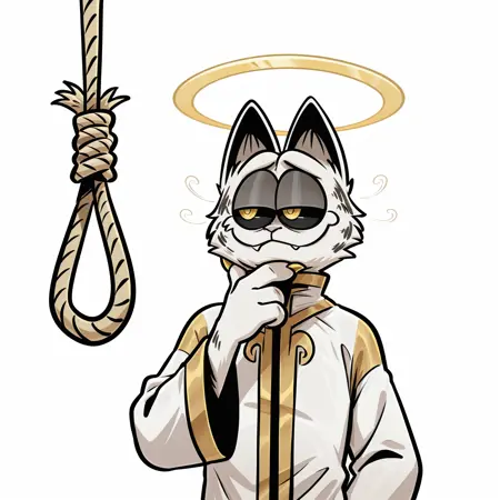 mlaofmd-lora, looking at noose, rope, noose, thinking, looking at object, hand on own chin