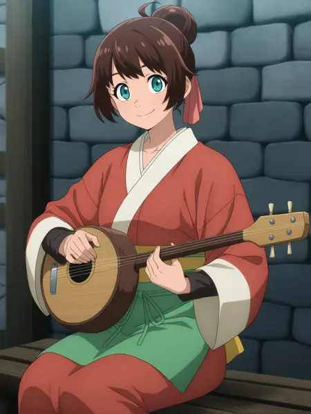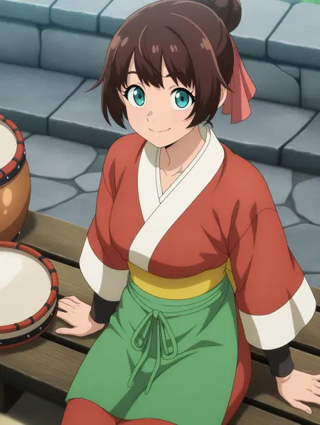 TG_Elsa, aqua eyes, short hair, brown hair, bangs, hair bun, hair ribbon, 1girl, official style, anime_screencap