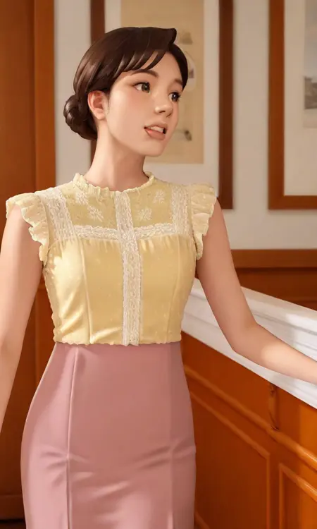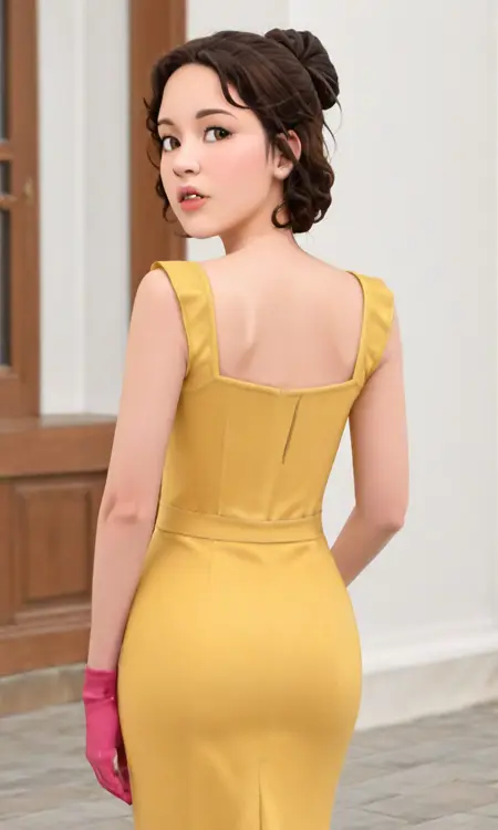 1girl,single hair bun,bangs,brown hair,brown eyes,yellow dress